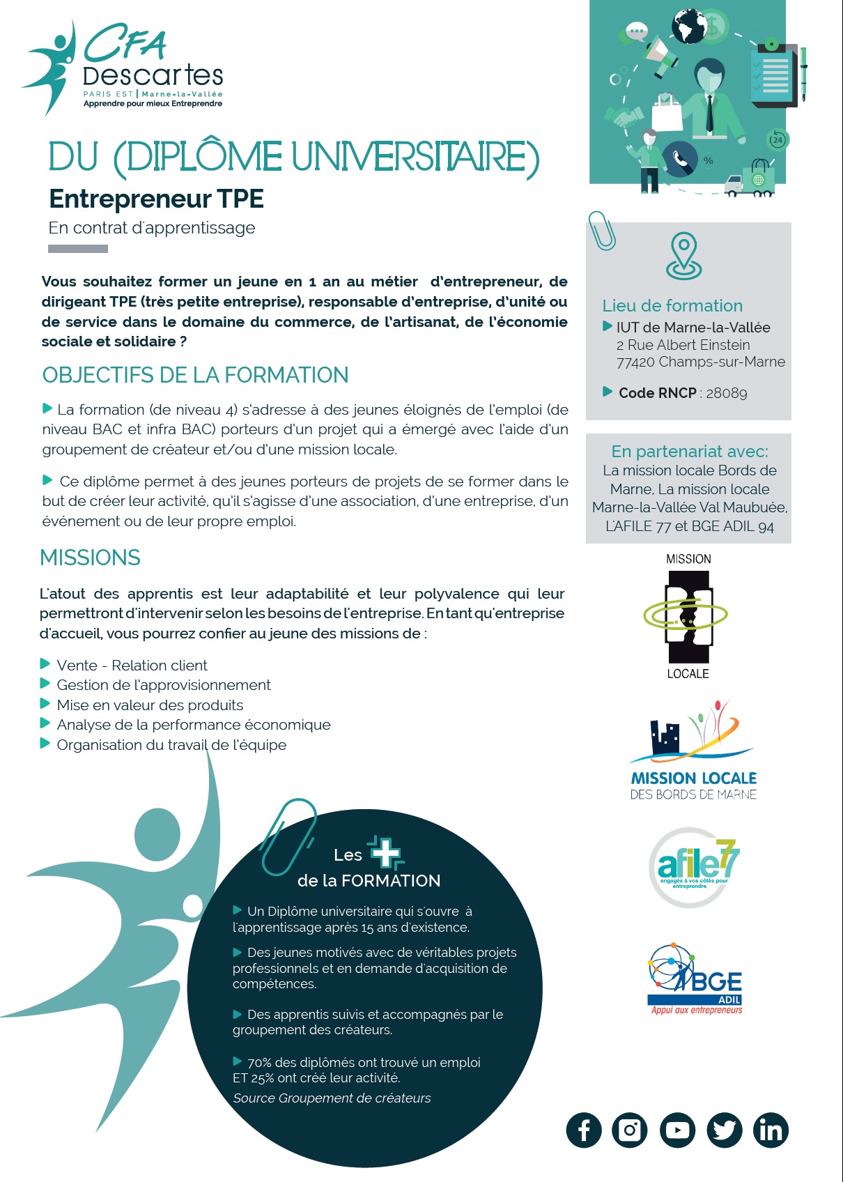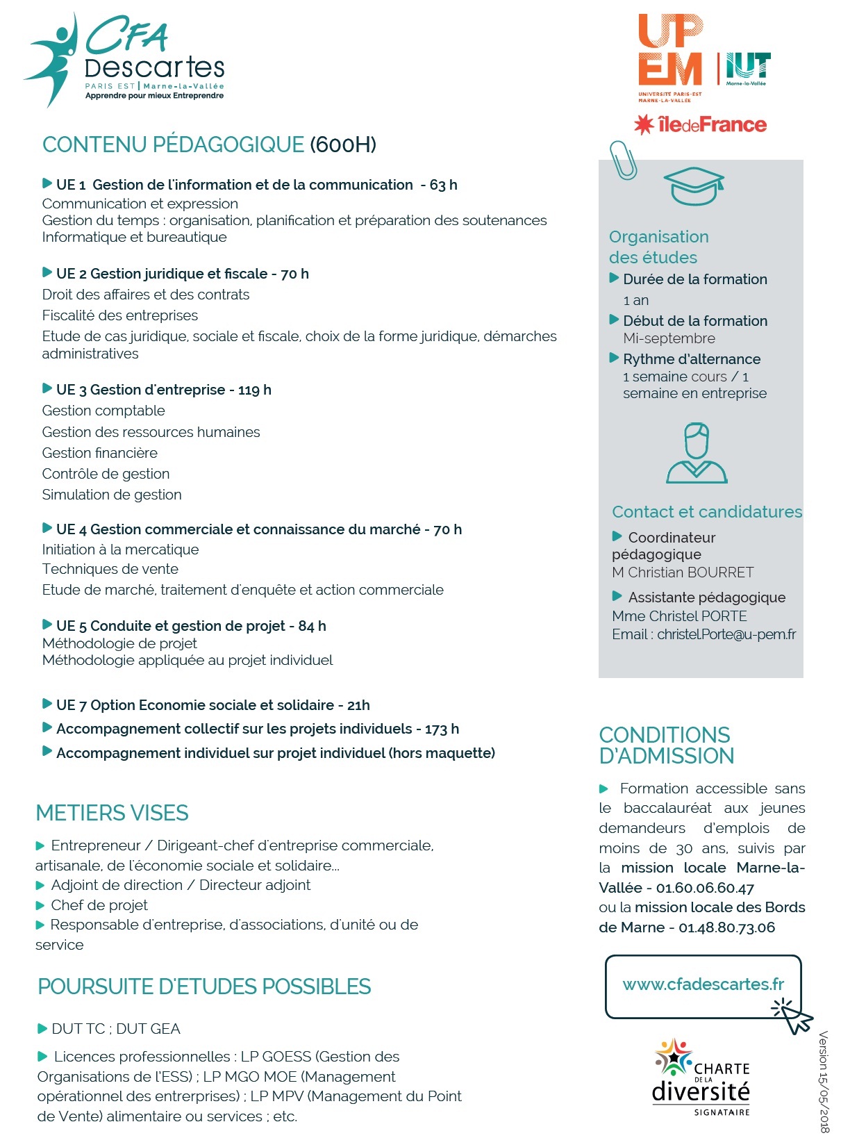 Avec le CFA Descartes, notre Groupement de Créateurs propose une nouvelle formation, accessible en contrat d'apprentissage, qui vise à former et qualifier (certification RNCP de niveau IV) tous ceux de 16 à 30 ans désireux de créer ou de reprendre une entreprise.